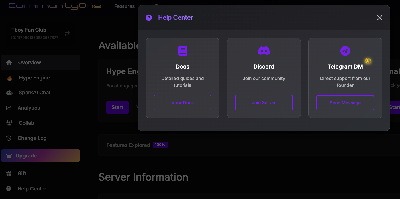 To invigorate your Discord server, it's crucial to enhance visibility by integrating Discord links across your digital platforms, particularly on channels where potential users may require assistance. Below is a screenshot of our dashboard configuration and we've set up in such a way that new users can directly ask our Discord for help without leaving our dashboard with our Spark AI feature.