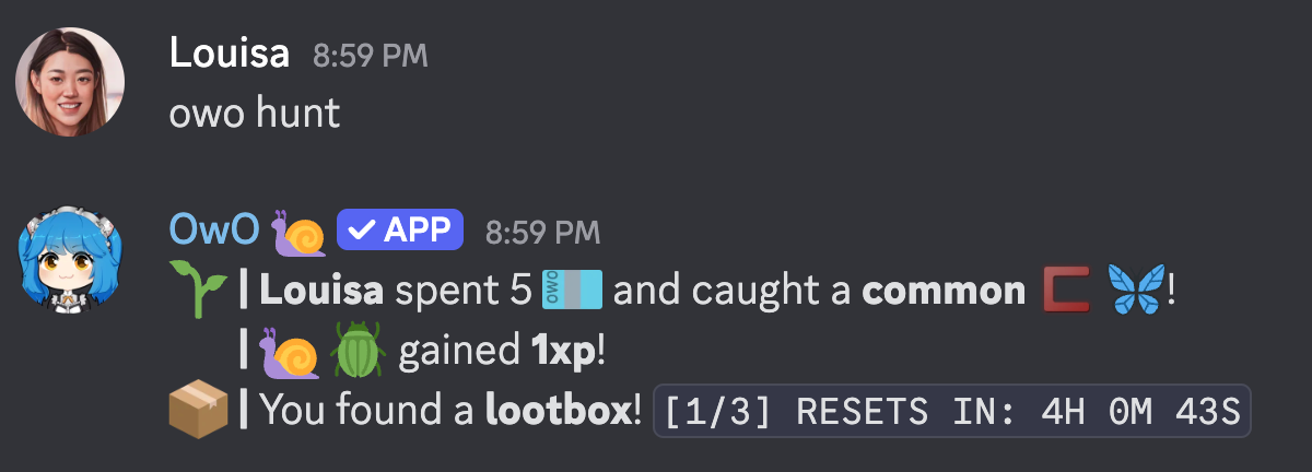- Hunting for Animals: OwO’s signature feature is animal collection. By typing owo hunt (or owo catch), players attempt to catch a random animal from the bot’s vast database of creatures (ranging from common pets like cats and dogs to mythical beings like dragons and special event creatures). Each successful hunt adds the animal to your Zoo, a collection of all animals you’ve obtained. Animals have different rarities, sell values, and “Zoo points.” Players often grind hunting to collect them all or find the rarest beasts. There’s even an auto-hunting feature called Huntbot (owo huntbot) that, once unlocked and upgraded, will automatically hunt for you for a set duration (useful for serious grinders). Casual players also enjoy the occasional fun emoji that appears alongside their catch result, further enhancing the excitement.