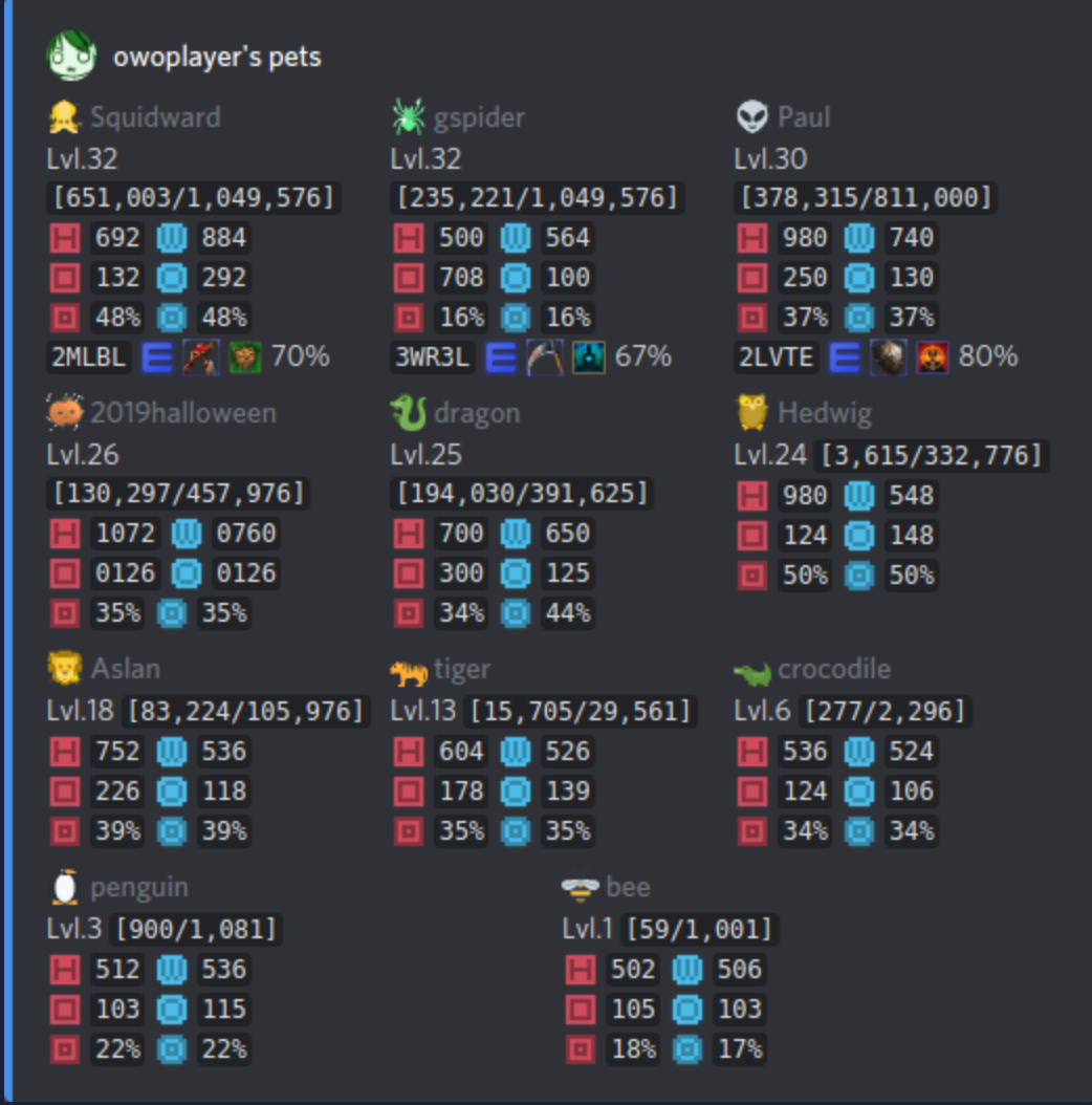 Pets bring the collection aspect to life by allowing personalization and progression – you’re not just catching static pokémon; you’re raising battle companions. An example of the owo pets command output, showing a user’s pets with their levels, experience, and stats. Each pet (animal) on the team has unique stats and can level up through battles, and any equipped weapon is indicated under their name.