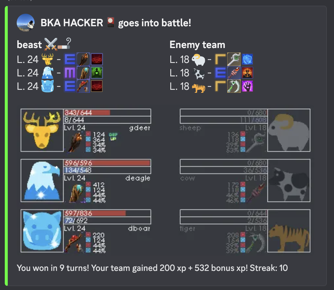 OwO Bot features a turn-based battle system where players pit teams of their captured animals (pets) against each other. A team can have up to three pets at once (no duplicates), each of which gains experience and levels up through battles and hunting. You can even maintain two separate teams and switch between them (e.g. one for PvE streaks, one for PvP) using the owo setteam command. Battles can be initiated against a random opponent for experience or directly against another user for fun (e.g. owo battle @username). Here’s how the mechanics break down: