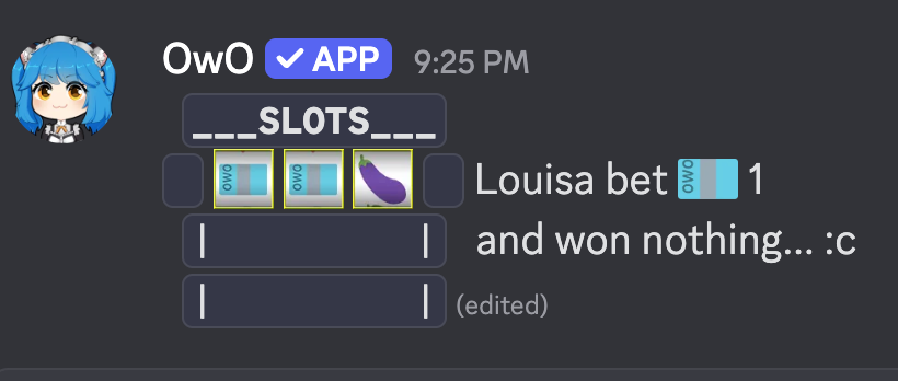 - Minigames and Gambling: To keep things interesting, OwO Bot offers a variety of minigames, many of which involve an element of chance (hence the gambling aspect). For instance, users can play owo slot to pull a slot machine for a chance at winning cowoncy or items, or owo coinflip to bet cowoncy on heads or tails. There’s even a lottery command and weapon crate lootboxes to randomly roll weapons of varying quality. These gambling features are purely for in-game rewards (no real money), but they add excitement and risk – players can lose their hard-earned cowoncy on a bad bet or hit the jackpot on a lucky roll.
