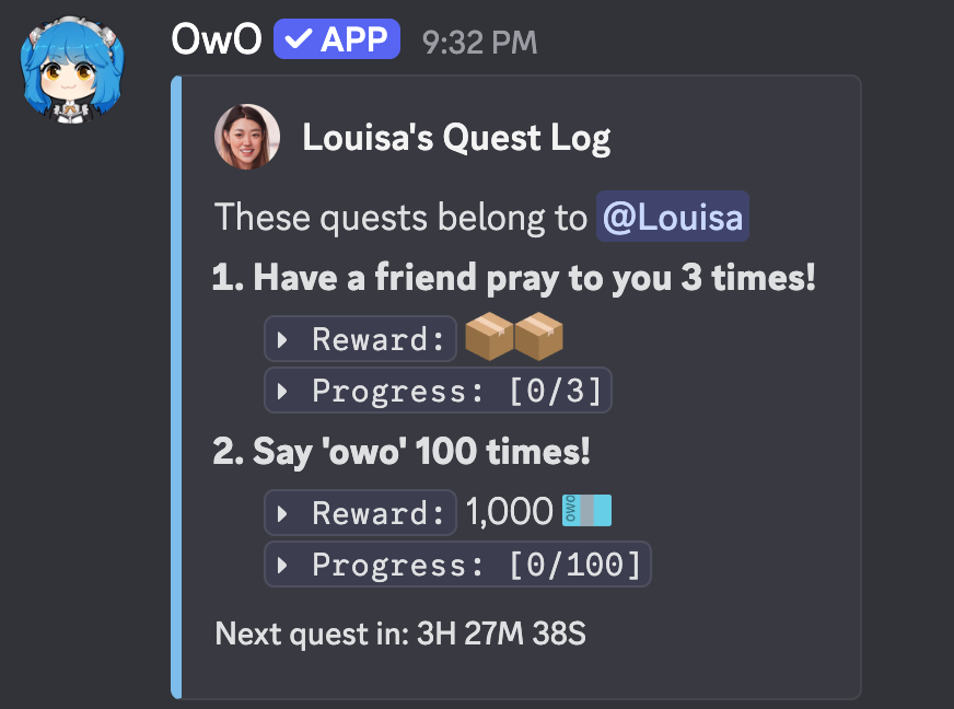 - OwO’s checklist and quest system also acts like a minigame: each day, you have a checklist of tasks (hunt a certain number of animals, win a battle, use a certain command, etc.), and completing them yields bonus rewards. This drives daily engagement and provides short-term goals that extend beyond simply accumulating currency.
