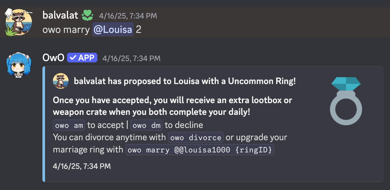 - Social and Roleplay Features: OwO includes some fun social commands that add personality to servers. For example, users can marry each other in OwO (owo marry @User and owo divorce), just for laughs and a leaderboard of “couples”. There are emotion commands like owo blush, owo cry, etc., which post cutesy emoticon responses. Notably, many of these commands now incorporate custom emoji to emphasize emotions and actions further, making interactions even more delightful.