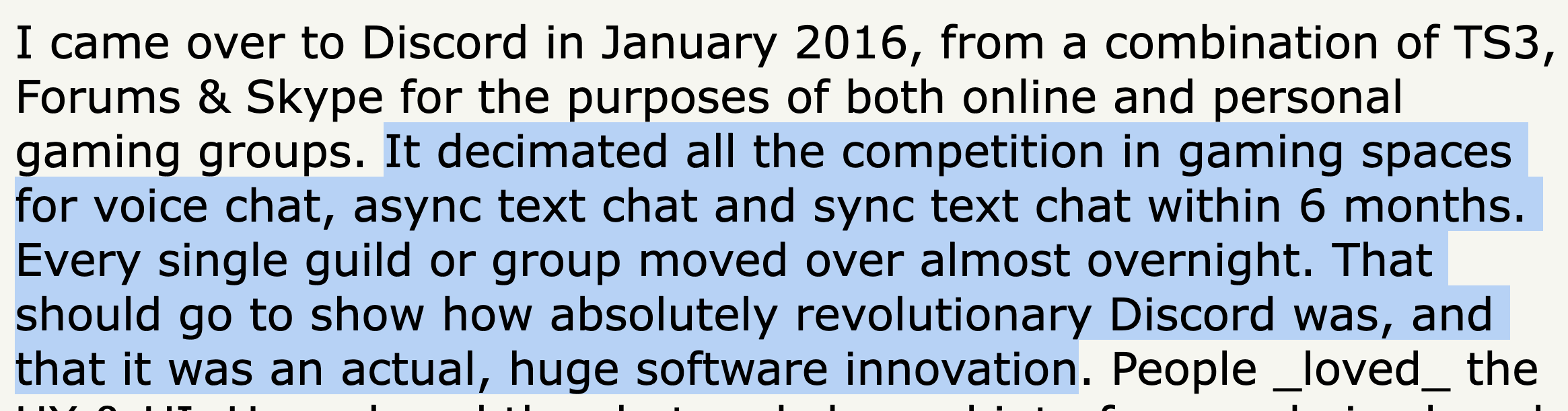 At the end of the day, Revolt is trying to compete by being as good as Discord, but open source and user-first. The harsh reality of competition in social platforms is that being “as good as” isn’t enough. People will endure the status quo unless a new option is significantly better in some key dimension. We’ve touched on this, but let’s underscore it: Discord itself didn’t win people over by being identical to prior platforms – it won by being better. Early on, it was better voice chat and a more seamless user experience that let Discord dethrone older tools. One commenter on Hacker News recounted how Discord’s free, easy-to-use model (one link invite, no setup fuss) allowed it to spread like wildfire in gaming groups, whereas older solutions like TeamSpeak had lots of friction (installs, server costs, etc.). Discord also benefitted from generous free features (no slot limits on servers, no need to pay for basic functionality like one had to with some VoIP servers) and a polished UI that “put much of the competition to shame” in voice/audio quality. By doing one thing great (voice) and everything else well enough, Discord reached a critical mass and then became an all-in-one platform people didn’t want to leave.