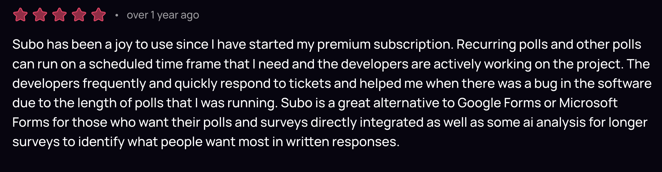 - Iterative Development and User Feedback: Subo highlights that it is “only getting better” with new features added regularly and openly asks users “tell us what you need”. This shows a commitment to iterate based on user feedback. The presence of a support Discord and an active development team means the product can evolve with its community. Many of Subo’s best features (like the skip logic or recently the support for Discord’s new native poll permissions) likely came from listening to what users wanted or where they experienced pain. For others building bot platforms, this underscores the importance of community-driven development: maintain a feedback channel, observe how users are actually using the tool (or where they workaround limitations), and update accordingly. Not only does this improve the product, but it also builds goodwill – users feel heard and thus more loyal.