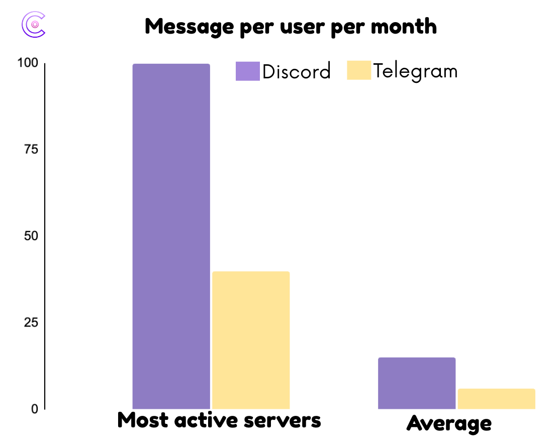Here’s where our bias comes out swinging: community engagement is almost always higher on Discord. The numbers back this up. In the most active Discord communities, it’s not unusual to see around 100 messages per member per month. Most comparable active Telegram groups struggle to hit even 40 messages per member per month. That’s less than half the engagement, by the simplest measure of activity. When comparing the data on average Discord usage versus average Telegram usage, Discord has 12 messages per member per month, which is 2 times higher than the 5 messages per member per month for Telegram.
